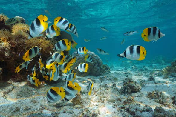 We'll start sailing in the Blue Lagoon, keeping an eye out for the sea creatures that live here. As we cruise around the island, you'll be able to see tropical, colourful fish and huge coral formations. Plus, if we're lucky we may see manta rays, sea turtles and even sharks.
