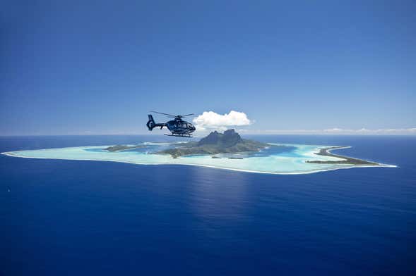 With a bird's eye view, you'll be able to marvel at all the stunning shades of blue of the lagoon and the lush green surroundings of the iconic Mount Otemanu.