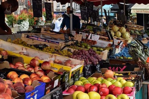 During the market tour, we'll visit different stalls to taste traditional products from Normandy. Among the main specialities are ciders and Calvados wines. In addition, Camembert and Pont-l'Évêque cheeses are very popular, as well as andouille de Vire, a typical sausage.