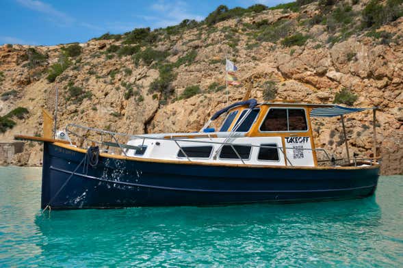 We'll set sail aboard a llaut, a typical Ibizan boat where you can relax while sunbathing and admiring the dazzling coastal waters. First of all, we'll pass by the beach of Port des Torrent, a tranquil natural harbor full of dry dock houses.