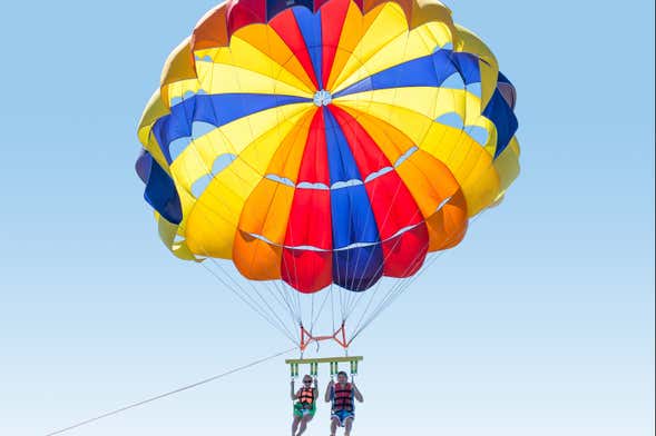 El instructor nos ayudará a ajustarnos bien el chaleco y el arnés y cuando estemos preparados, comenzaremos a practicar parasailing. La lancha irá tomando cada vez más velocidad para que vayáis ascendiendo poco a poco con el impulso del paracaídas.