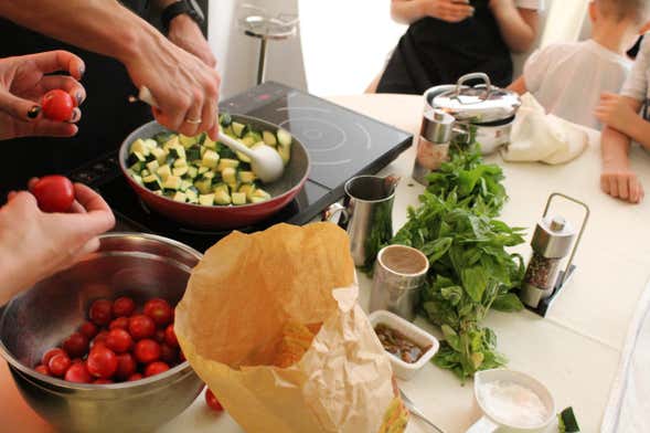Tras el taller de pasta, elaboraremos un segundo plato a base de pescado y verduras. Una vez concluido el cocinado, nos sentaremos a la mesa para probar las delicias que hemos preparado, acompañando el banquete con vino siciliano.