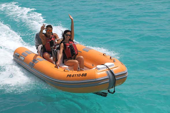 Hechas las presentaciones, os impartiremos una sencilla formación sobre seguridad. ¡Ya estáis listos pilotar vuestra lancha rápida! Además, un monitor de habla española os guiará en su propia lancha durante toda la actividad. Nos dirigiremos hacia el norte por los acantilados de la Reserva Natural Cabezas de San Juan cruzando el bosque húmedo de El Yunque. ¿Sabíais que este fue el paisaje que los conquistadores españoles vieron por primera vez en Puerto Rico?