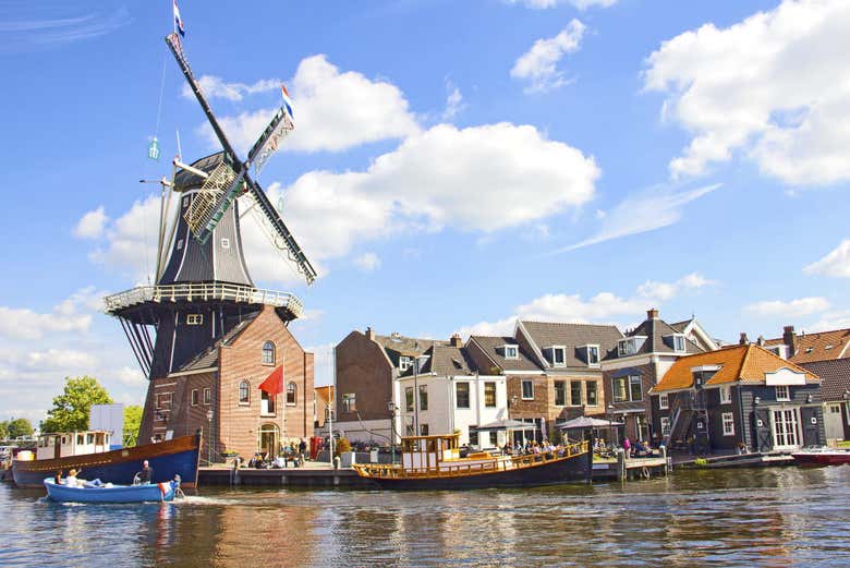 Recorreremos en primer lugar una zona de hofjes, antiguos patios rodeados de viviendas históricas. La visita continuará a orillas del río Spaarne, donde veremos el Molen De Adriaan, un emblemático molino de viento que data del siglo XVIII.