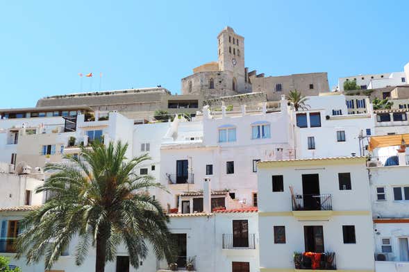 Nos adentraremos en el centro histórico, rodeado por una muralla del siglo XVI. Este barrio es conocido como Dalt Vila y se encuentra en la parte más alta de la ciudad. Para llegar hasta allí, iremos dando un paseo por las callecitas blancas y empedradas, que nos enamorarán desde el primer momento. Una vez arriba, contaremos con unas vistas espectaculares
