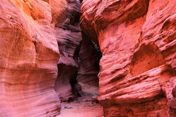 Accederemos al cañón Peek A Boo a través de una pista arenosa y, después, recorreremos un corto tramo por campos de onduladas dunas. Os sorprenderán los paisajes de arenisca rojiza de este desfiladero, que en algunas partes alcanza los 30 metros de profundidad.