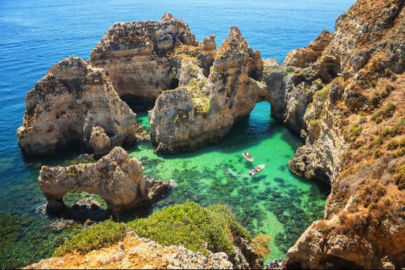 También pasaremos por las playas de los alrededores, entre las que destacan Praia D. Ana o Praia do Camilo, dos de las más bellas de la zona. Además, fondearemos el barco para que podáis daros un refrescante baño en las aguas de una bahía protegida.