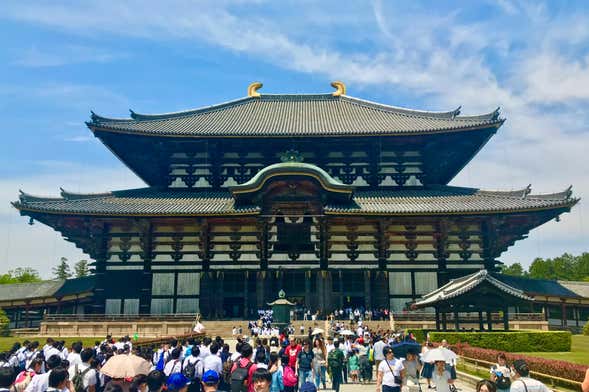 En primer lugar, nos dirigiremos al majestuoso Todai-ji, un destacado templo budista de gran importancia histórica. Al entrar por la imponente puerta Nandaimon, os quedaréis impresionados por la estatua del Gran Buda de Nara, una gigantesca escultura de bronce que domina la sala principal del templo. Contemplaremos la delicada arquitectura de este santuario y disfrutaremos de la serenidad del lugar mientras recorremos los jardines que lo rodean.
