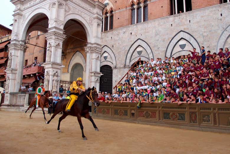 Mientras recorremos la plaza iremos conociendo los orígenes medievales de estas competiciones hípicas, en las que se enfrentan entre sí las contradas (distritos) de Siena. Cada jinete porta los colores y vestimentas propias de su barrio o contrada, anhelando que su distrito se alce con la victoria final. El vencedor recibe un palio, es decir, un paño de seda o tela preciosa que da nombre a la carrera. No hay mayor honor para un jinete que representa a su contrada que recibir el palio de ganador.