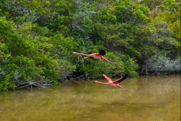 Vous pourrez y apercevoir des flamants roses, des vanneaux téros, des canards pilets, des poules d'eau. Tout en observant ces espèces d'oiseaux, vous en apprendrez davantage sur les particularités de cet écosystème unique dans l'archipel. Vous vous approcherez d'ailleurs de la seule zone humide de la région où l'on peut apprécier les quatre types de mangroves des Galápagos.