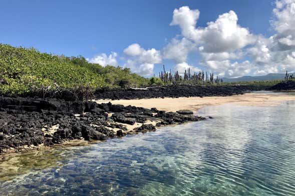 Cet endroit est également rempli de palo santo. Saviez-vous que les anciens chamans l’utilisaient à des fins thérapeutiques ? De plus, en raison de ses conditions géographiques, vous verrez aussi des zones de cactus et de buissons de sal. Soyez attentif, car au sol, vous pourriez croiser l’iguane endémique des Galápagos. Et, de l’autre côté de l’île, vous apercevrez des dizaines d'otaries.