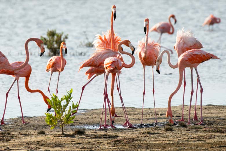 Après une heure d'exploration de cet univers subaquatique, vous entamerez un court transfert vers des mangroves secrètes de l'île. Vous y trouverez l'habitat d'élégants flamants roses des Caraïbes. De plus, pendant toute l'aventure de snorkeling, vous serez également entouré de ces magnifiques oiseaux.