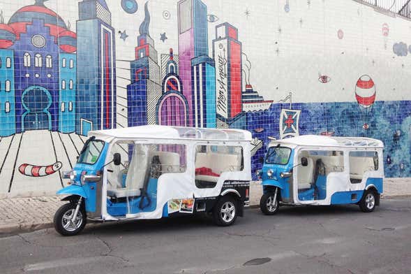À l'heure convenue, rendez-vous dans la calle Largo do Regedor, derrière le théâtre national Dona Maria II, pour monter à bord d'un tuk tuk, le véhicule original avec lequel vous parcourrez les rues de Lisbonne. Ce moto-taxi typique de l'Asie du Sud-Est a trouvé sa place dans la capitale portugaise, devenant l'un des moyens de transport les plus utilisés par les touristes. Grâce à son toit convertible et à l'absence de portes latérales, le tuk-tuk est la meilleure option pour faire une visite panoramique dans Lisbonne.