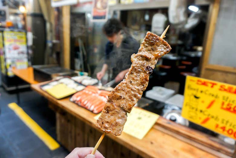 Pour commencer, vous dégusterez un takoyaki, l'un des aliments les plus typiques de cette région. Après cette petite boule de poulpe panée, vous goûterez des fruits de mer et d'autres plats chauds.