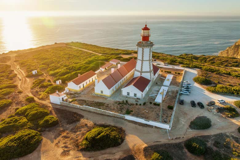 Le moment tant attendu de l'excursion : le coucher de soleil sur le Cap Espichel vu depuis le bateau. À la tombée de la nuit, son phare et ses falaises forment un décor unique, digne d'une carte postale.
