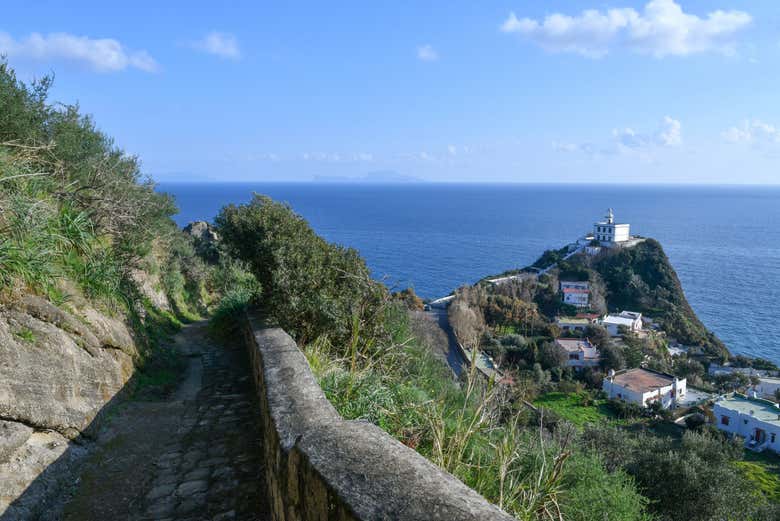 Seguiremo quindi questo antico sentiero borbonico, tra lecci e macchia mediterranea, durante il quale potremo osservare delle splendide viste su Monte di Procida, sede di ciò che resta dell'antico vulcano Archiflegreo.