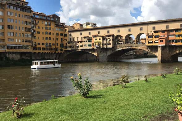 Durante la crociera, ammirerete edifici emblematici come la Galleria degli Uffizi e il Corridoio Vasariano, così come un giardino che si erge sopra il fiume, appartenente all'Associazione Canottieri. Ammirerete anche i ponti che collegano entrambe le parti della città, come il Ponte Santa Trinita, decorato di statue, e l'iconico Ponte Vecchio. Scoprirete luoghi di grande bellezza visibili solo da questa prospettiva!