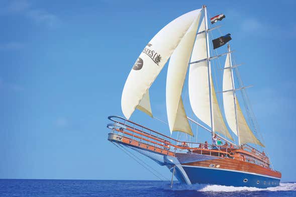 Cominceremo a solcare le acque del Mar Rosso a bordo di un'imbarcazione che vi sorprenderà per la sua incredibile decorazione ispirata alle grandi navi pirata.