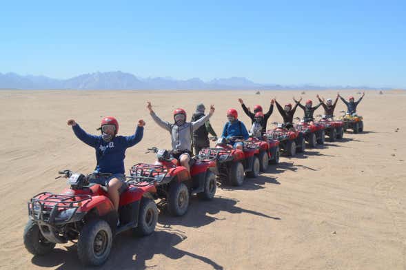 Attraverseremo chilometri e chilometri di sabbia fino a raggiungere il luogo in cui vi attenderanno i quad. A bordo di questi veicoli, continueremo a esplorare il deserto di Hurghada sfrecciando alla scoperta di questo peculiare paesaggio per 45 minuti. Successivamente, daremo il via a un tour in buggy di 20 minuti.