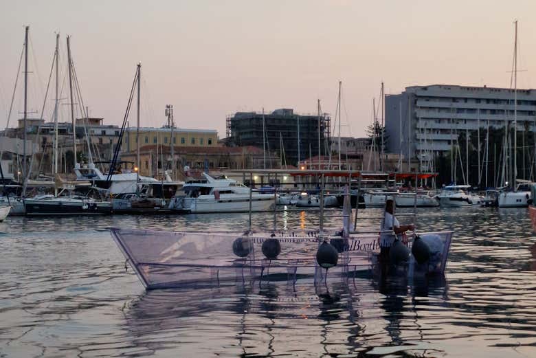 Ci troveremo all'orario indicato in via Riva Forte Gallo, dove saliremo a bordo di un'imbarcazione completamente trasparente. Sin dal primo momento, sentirete l'emozione di galleggiare sulle acque cristalline di Siracusa, grazie alla struttura in vetro dell'imbarcazione. Vi sembrerà di navigare sospesi in mare!