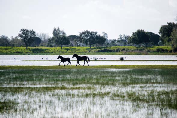 Na nossa rota guiada por Doñana também visitaremos as marismas do Guadalquivir. Aprenderemos a distinguir a rica fauna e flora que se conserva nesta zona protegida de beleza natural única. Faremos uma nova parada nas proximidades para visitar o povoado de La Plancha, um lugar onde veremos como viviam os antigos habitantes destas terras.