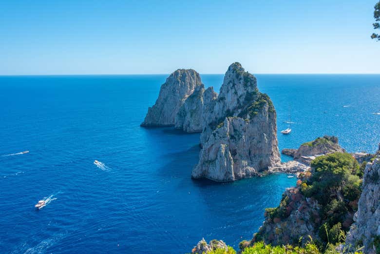 Continuaremos navegando em direção à Villa Malaparte, uma das estruturas mais emblemáticas da região, e aos Farallones, as três famosas formações rochosas que são o símbolo máximo da ilha. Momento fotográfico!