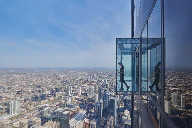 Para chegar ao 103º andar, você precisará pegar o elevador Skydeck Chicago, que atinge uma velocidade de 480 metros por minuto. Você chegará em apenas 60 segundos! Ao chegar ao topo, você encontrará quatro varandas com piso de vidro projetando-se da fachada. Sem dúvida, a melhor maneira de ver a cidade em 360 graus.