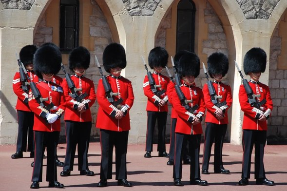 Às segundas, quartas e sextas-feiras, assistiremos à Troca da Guarda, quando os soldados da Divisão da Casa Real assumem os seus postos. Às terças e quintas-feiras, veremos a Troca da Guarda a Cavalo, ou a Parada da Guarda a Cavalo, com a cavalaria montada da Household. Se você estiver conosco no sábado, assistiremos à Inspeção da Nova Guarda, quando o capitão inspeciona os soldados que chegam, garantindo que estejam prontos para assumir suas funções e que seus uniformes estejam em perfeitas condições.