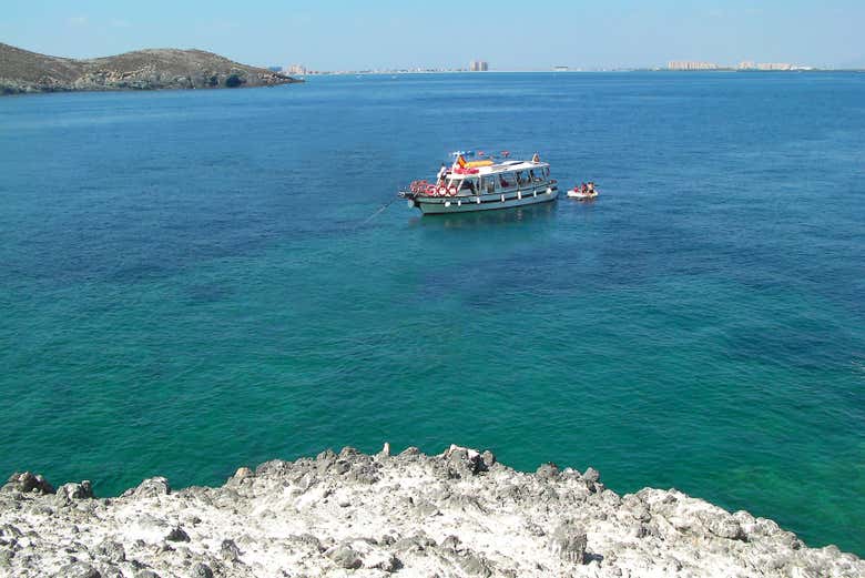 Durante a travessia, faremos uma parada de meia hora para tomar um banho. As áreas de ancoragem podem variar de acordo com o estado do mar: ilhota do Farallón, ilha Grosa, enseada do Esparto ou no Mar Menor. Durante esse período de banho, temos colchonetes gigantes e equipamentos básicos para aqueles que desejarem praticar snorkel.