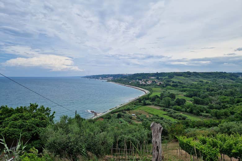 Aos poucos, começaremos a pedalar por uma trilha que margeia a Costa dei Trabocchi. Você sabe por que recebeu esse nome? Uma dica: tem a ver com máquinas de pesca típicas da costa adriática. E o que você acha das vistas? Desse mirante, você poderá desfrutar de uma panorâmica da costa, suas águas turquesas e penhascos íngremes.
