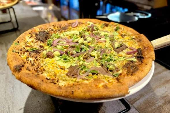 Também passearemos pelo passeio do rio, onde saborearemos uma fatia de pizza com costela barbecue, sálvia frita, cebola roxa e um delicioso molho cremoso de queijo azul. Você vai adorar!