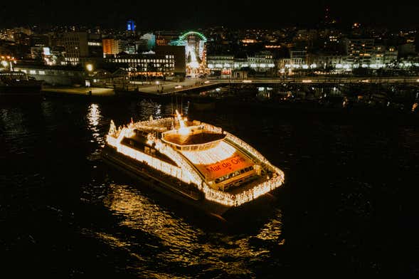 Depois de um coquetel de boas-vindas com música natalina tocada por um DJ, você desfrutará do passeio noturno pela ria de Vigo em um barco repleto de detalhes, tanto no seu interior como em suas instalações interiores. Luzes por todos os cantos, árvores de Natal, cantigas natalinas e até um set onde conhecer o Papai Noel o Grinch, ou o duende verde. O que mais se pode pedir? Há muitas outras surpresas!